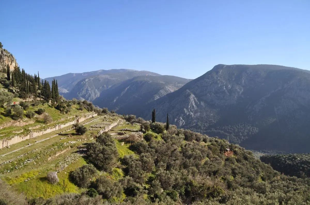 The final temple kept the same Doric plan (6 by 15 columns) and reused some earlier material. Its pediments showed Apollo with the Muses on one end and Dionysus with Maenads on the other. Inscriptions like “Know thyself” and “Nothing in excess” were carved on or near the temple, along with a mysterious letter “E” whose meaning is still debated. When you stand on the terrace today among the surviving columns, you’re on the platform that held one of the most sacred buildings in the ancient world.